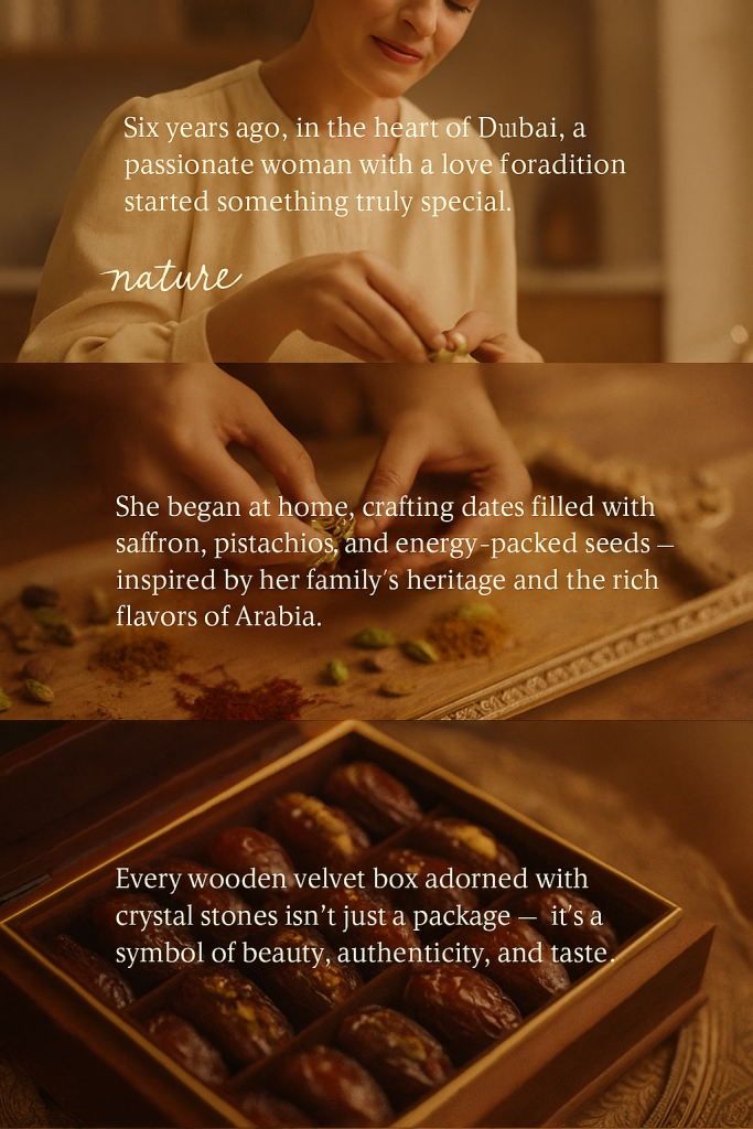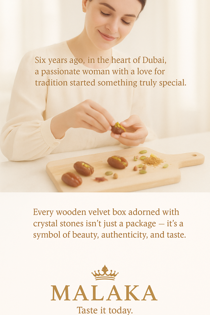 6 years ago, in the heart of Dubai, a passionate woman with a love for tradition started something truly special. She began at home, crafting dates filled with saffron, pistachios, and energy-packed seeds — inspired by her family’s heritage and the rich flavors of Arabia. It was a blend of nature, elegance, and soul. What started as a homemade gift among friends soon became the sweet highlight of luxury gatherings. Today, **Malaka** is a name trusted and cherished in the UAE and across several Arab countries — especially by elite families and refined individuals seeking something truly different. Every wooden velvet box adorned with crystal stones isn’t just a package — it’s a symbol of beauty, authenticity, and taste. If you’re looking for a luxurious experience or a meaningful gift,